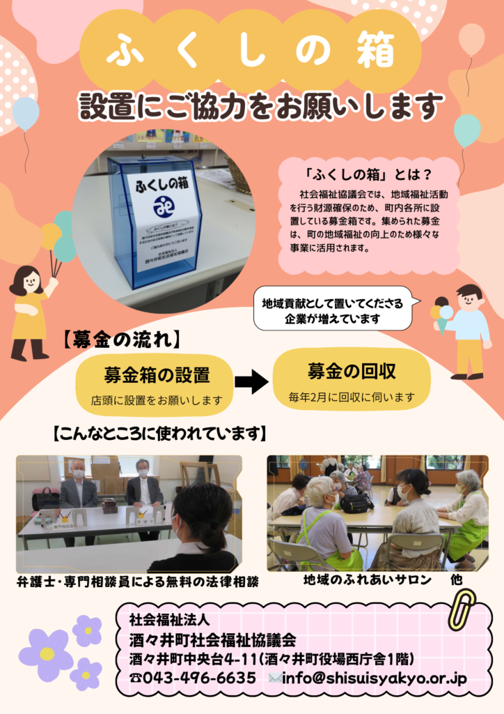 酒々井町内の地域福祉事業に活用される「ふくしの箱」。あなたのお店・事業所にも設置してみませんか?