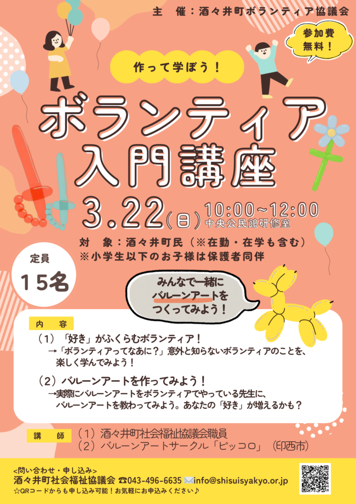 内 容 バルーンアートを作ってみよう!(実技)、「好き」がふくらむボランティア!(講義)
